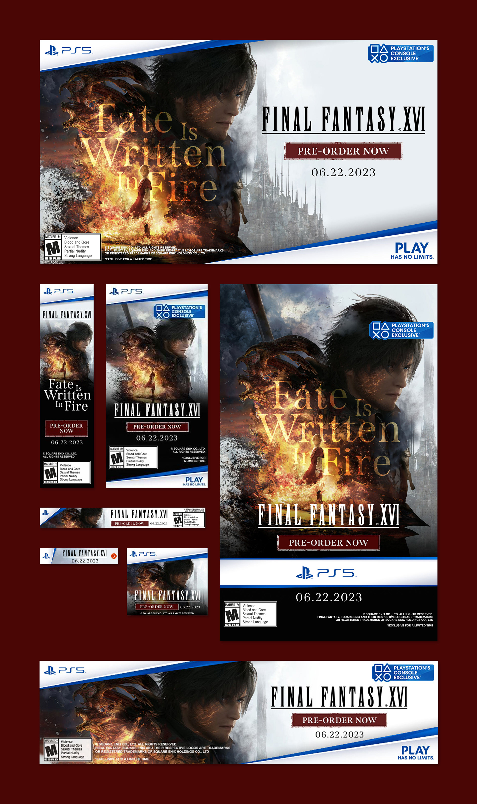 Examples of web marketing banners I designed as Senior Creative Designer at Square Enix for Final Fantasy XVI in 2022/2023. At the time, I was helping to develop the brand guidelines as the project evolved. Using these early guidelines and artwork from the studio, I created the initial concepts for the date and pre-order announcement. These designs later served as the template for subsequent marketing web banners..