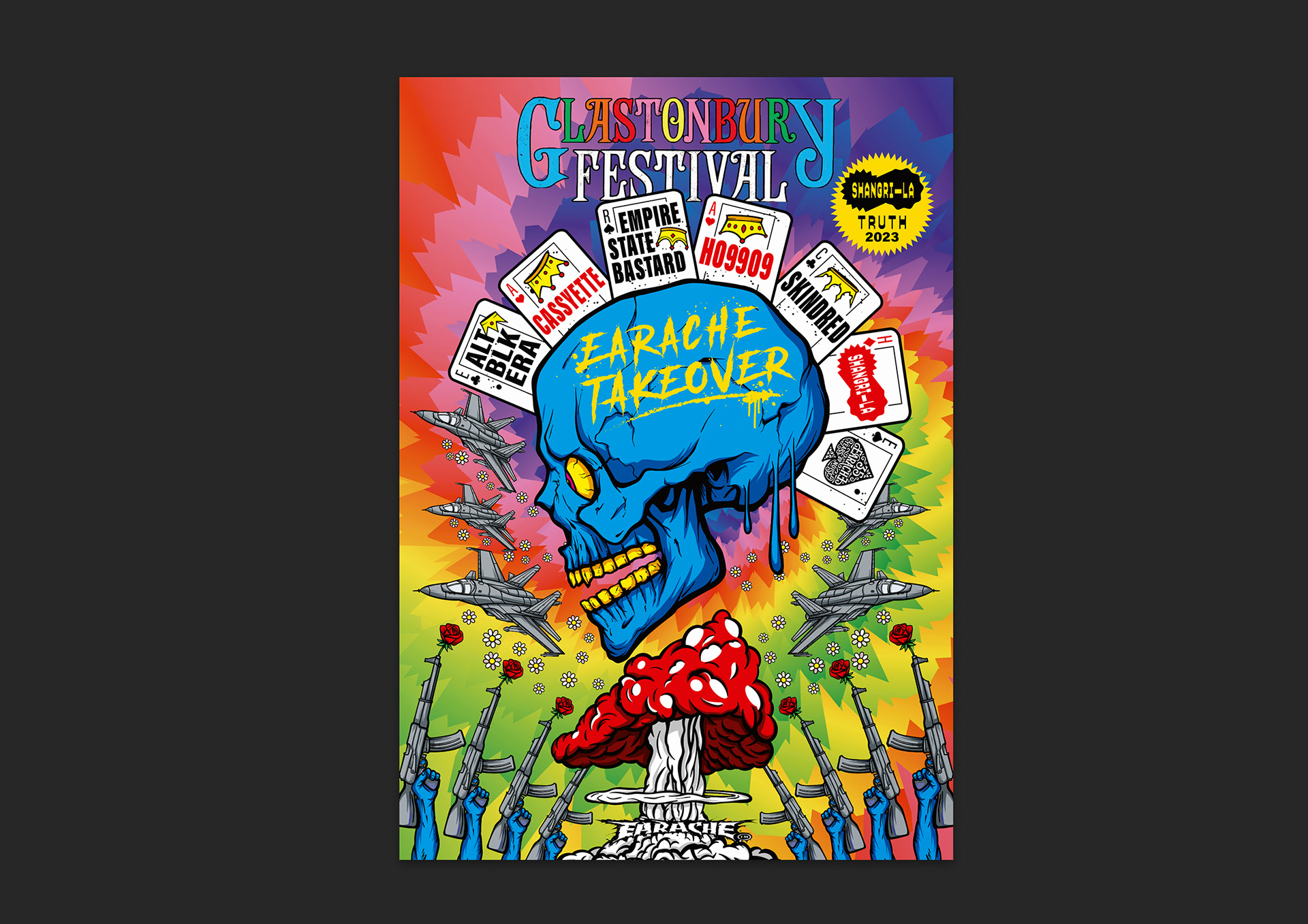 I had the chance to create artwork for Earache Records’ takeover at the Shangri-La stage at Glastonbury Festival 2023. Embracing the heavy metal aesthetic, I illustrated a skull with a mohawk made of playing cards, a unique way to showcase the band lineup without the traditional way of listing them. The piece was made using a blend of Adobe Fresco and Adobe Illustrator.