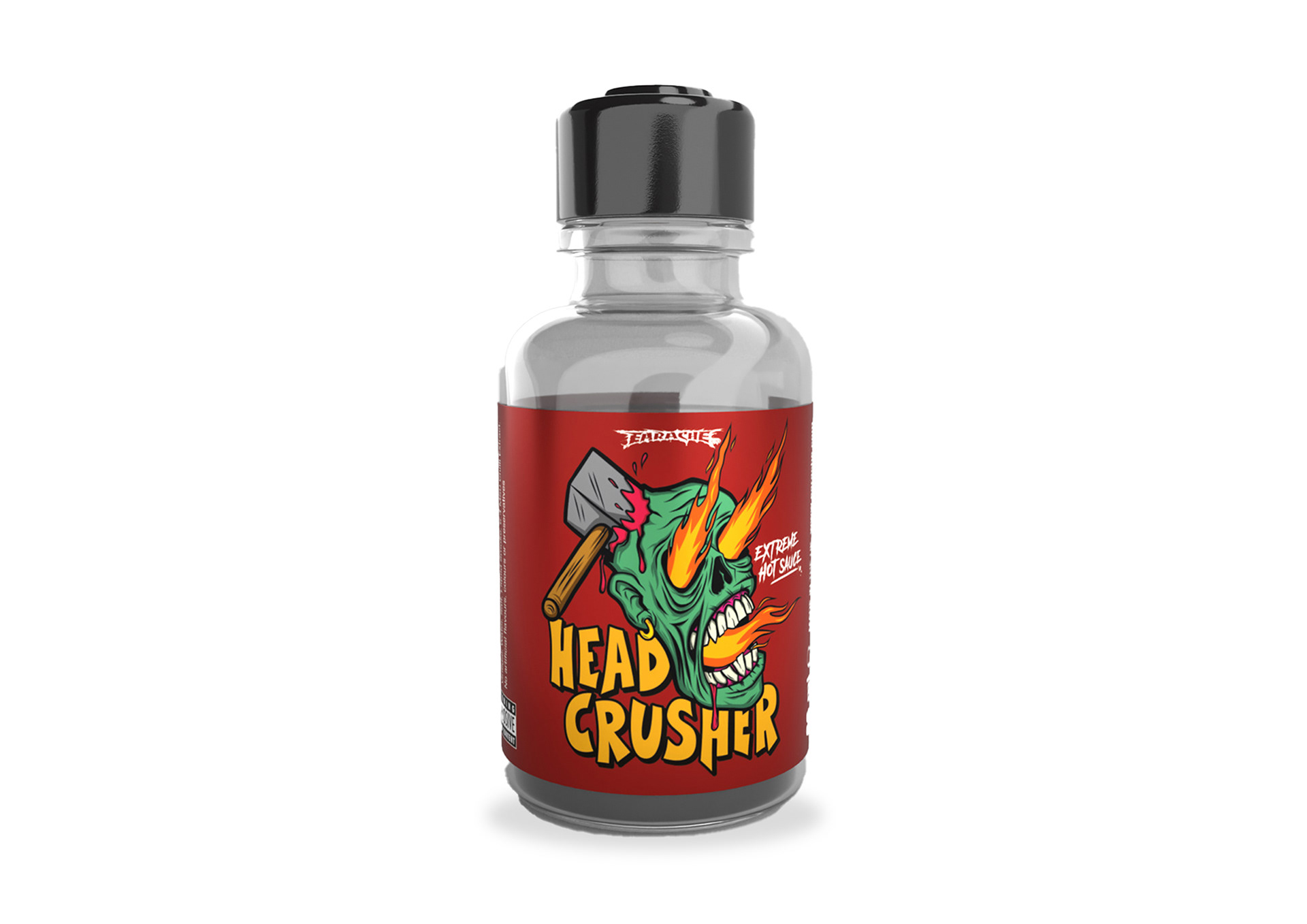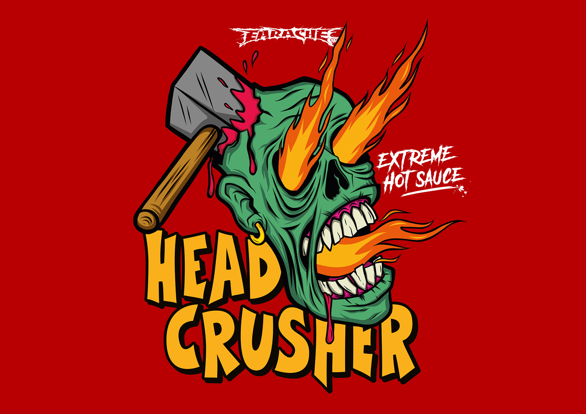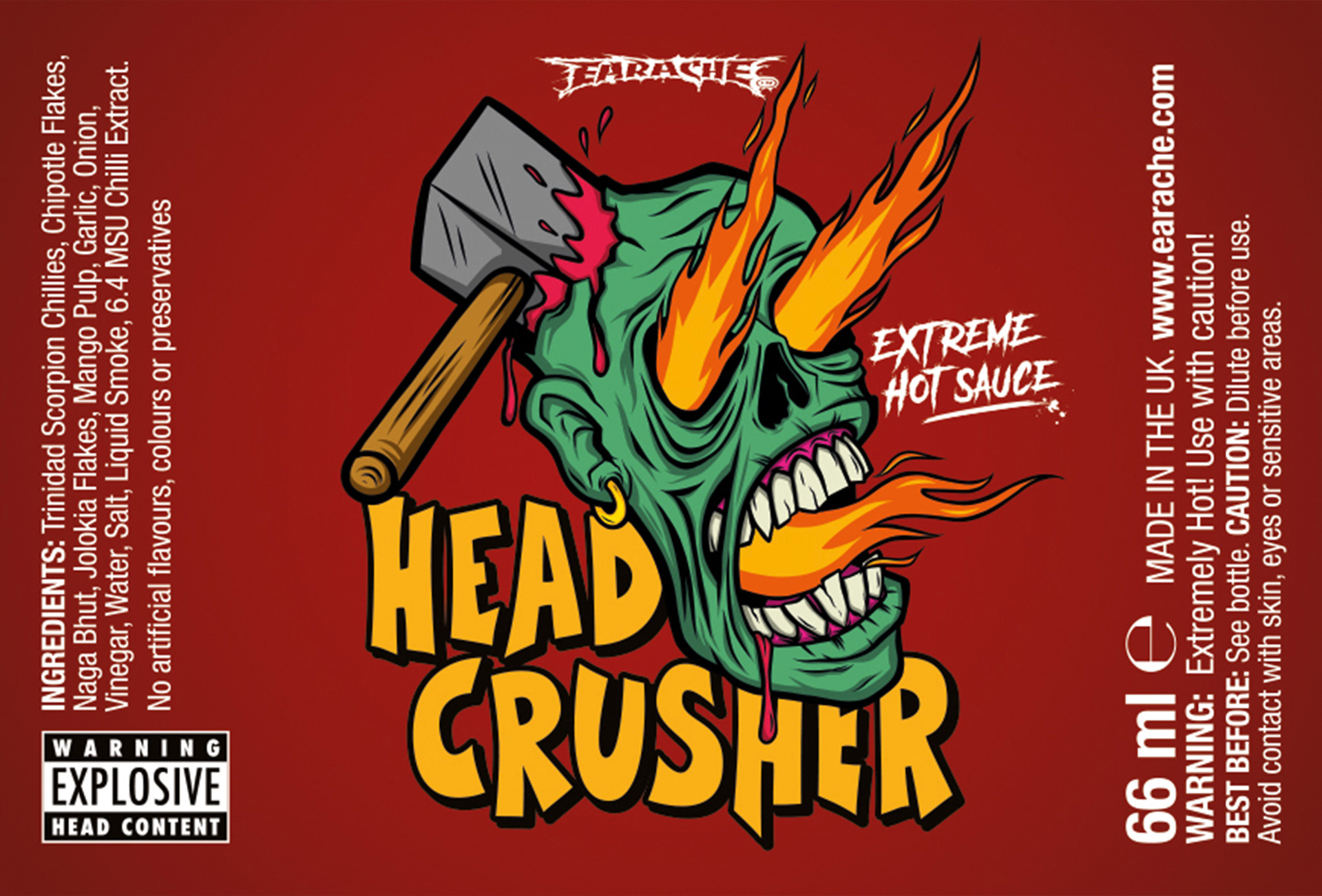 I was tasked with creating a label design for Earache’s new hot sauce, “Head Crusher.” The goal was to capture an over-the-top, cartoon vibe using lots of vibrant colours with the design having to feel energetic and bold, hinting at the fiery heat of the sauce.