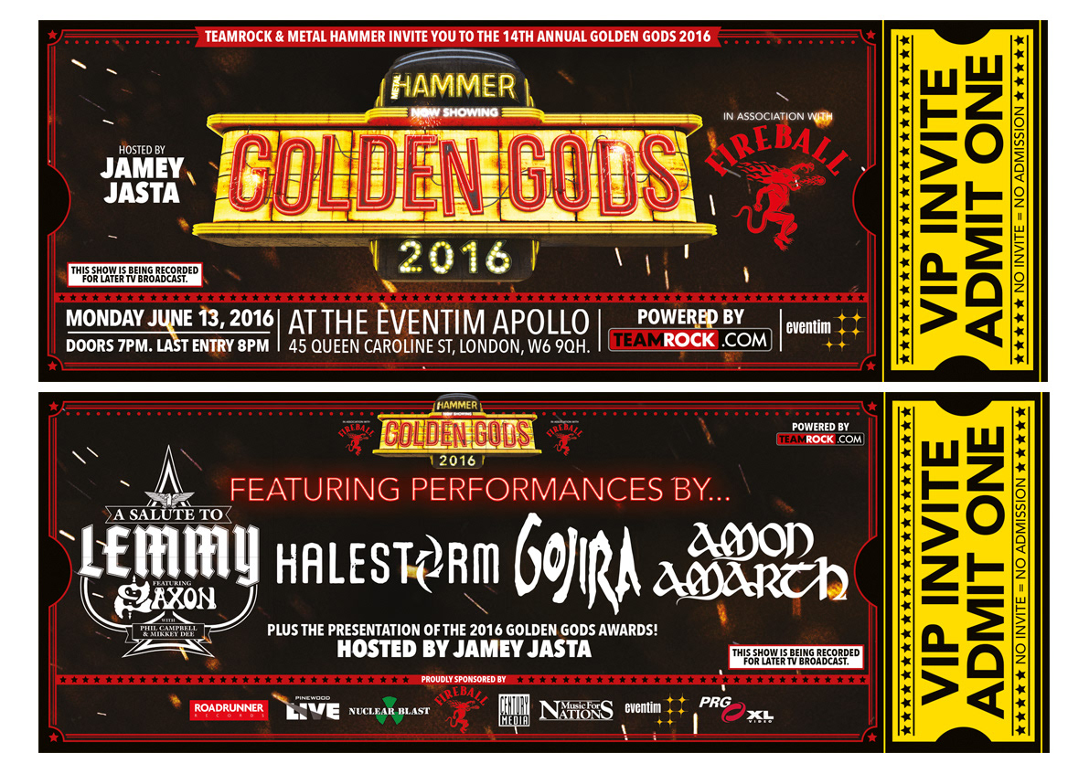 As art editor of the brand I was tasked with creating a theme for the awards as well as implementing the creative direction. Using the venue's history as a basis for the awards and to use the vintage cinema idea as an influence. I got to work extremely closely with Magictorch who were given a rough sketch and brief to build the logo from. The concept used a front of a cinema as a base, the stone framework hinting at the shape of the venue itself. We then created an animation of this to be used at the start of the show which featured live performances from Halestorm, Gojira, Amon Amarth. In additions to a very special tribute to Lemmy from Saxon after his death in the previous December, with the surviving members joining them on stage. In addition to the Golden Gods branding and assets I also created the logo for this, reusing assets previously made by Magictorch for our Lemmy tribute issue as well as creating new elements. This was used across all brands and social media outlets.