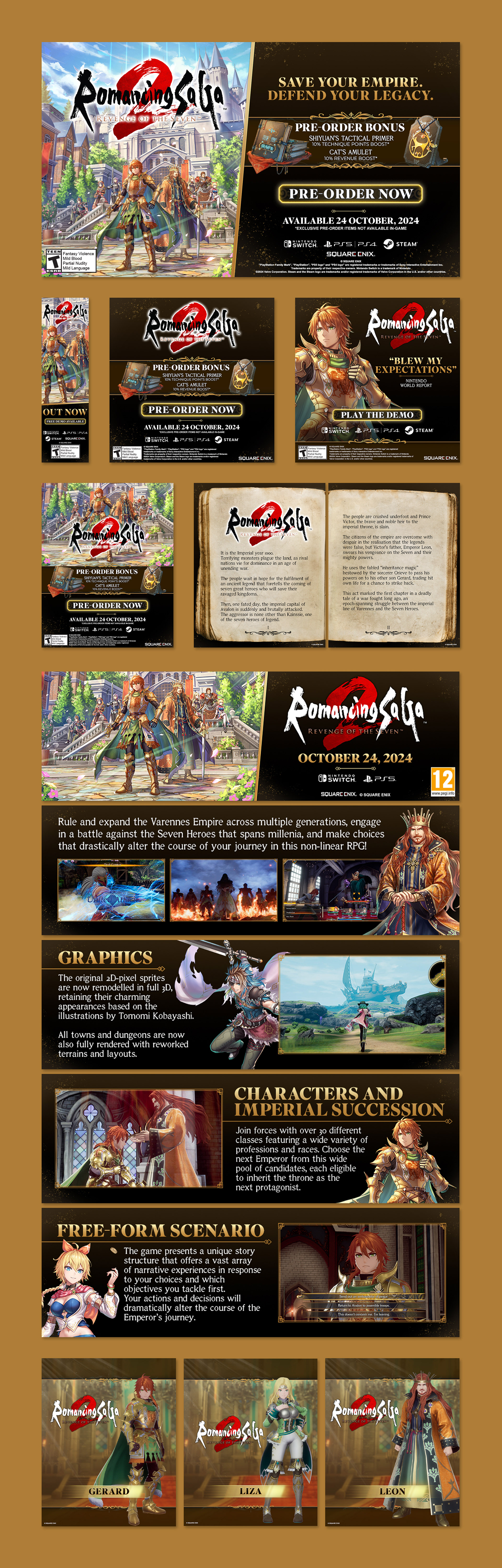 While I was Senior Creative Designer at Square Enix, I worked on Romancing SaGa 2: Revenge of the Seven, developing the visual identity predominantly for the UK and US release as well as the packaging. During this process I also built a modular design setup that made it easy to quickly edit, template, and roll out the huge range of promo assets needed for the campaign for the title.