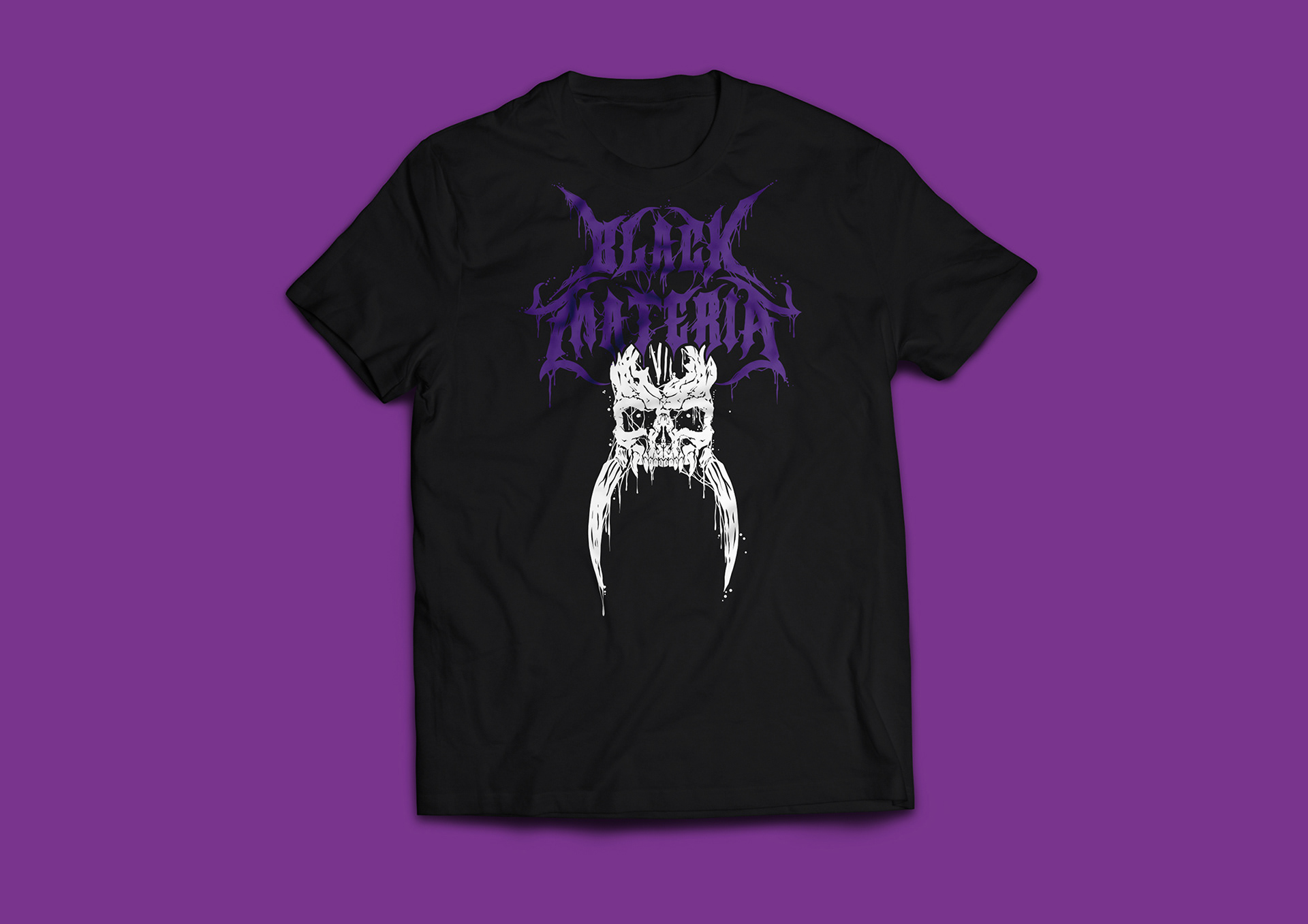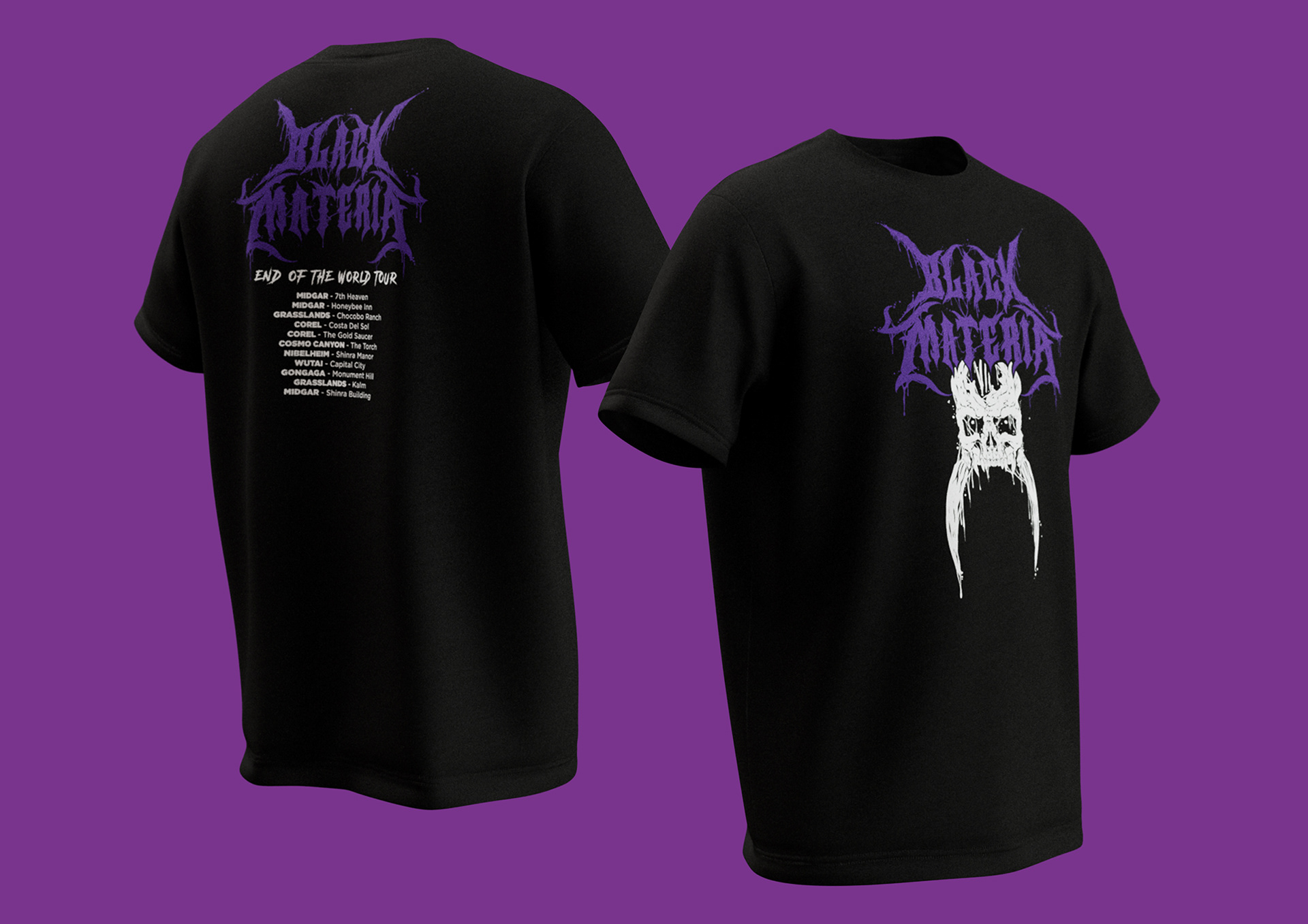 Shirt design and illustration created during my time at Square Enix as part of a wider project to refresh merchandise for the webstore. Inspired by the legendary Final Fantasy VII and its remake Final Fantasy VII Rebirth, the concept reimagines the iconic Black Materia as a fictional black metal band. The front features the band artwork, while the reverse playfully lists ‘tour dates’ set across in-game locations.