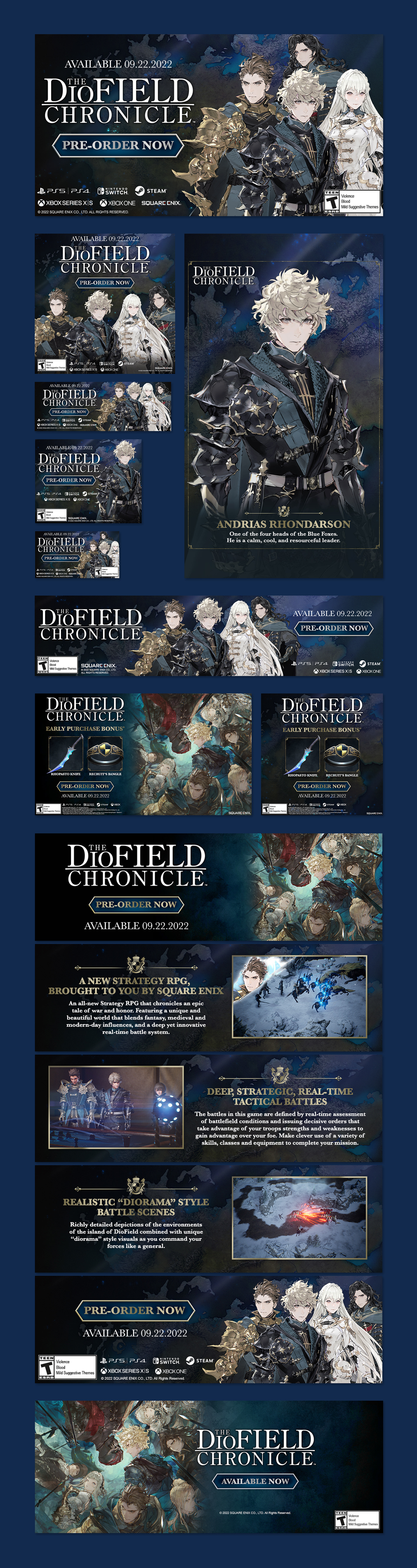 While working as Senior Creative Designer at Square Enix, I worked on designs for The DioField Chronicle, helping develop the visual identity for the UK and US markets including packaging, social and paid media assets. I also developed a template system to make producing and updating campaign materials quicker and more consistent across formats.