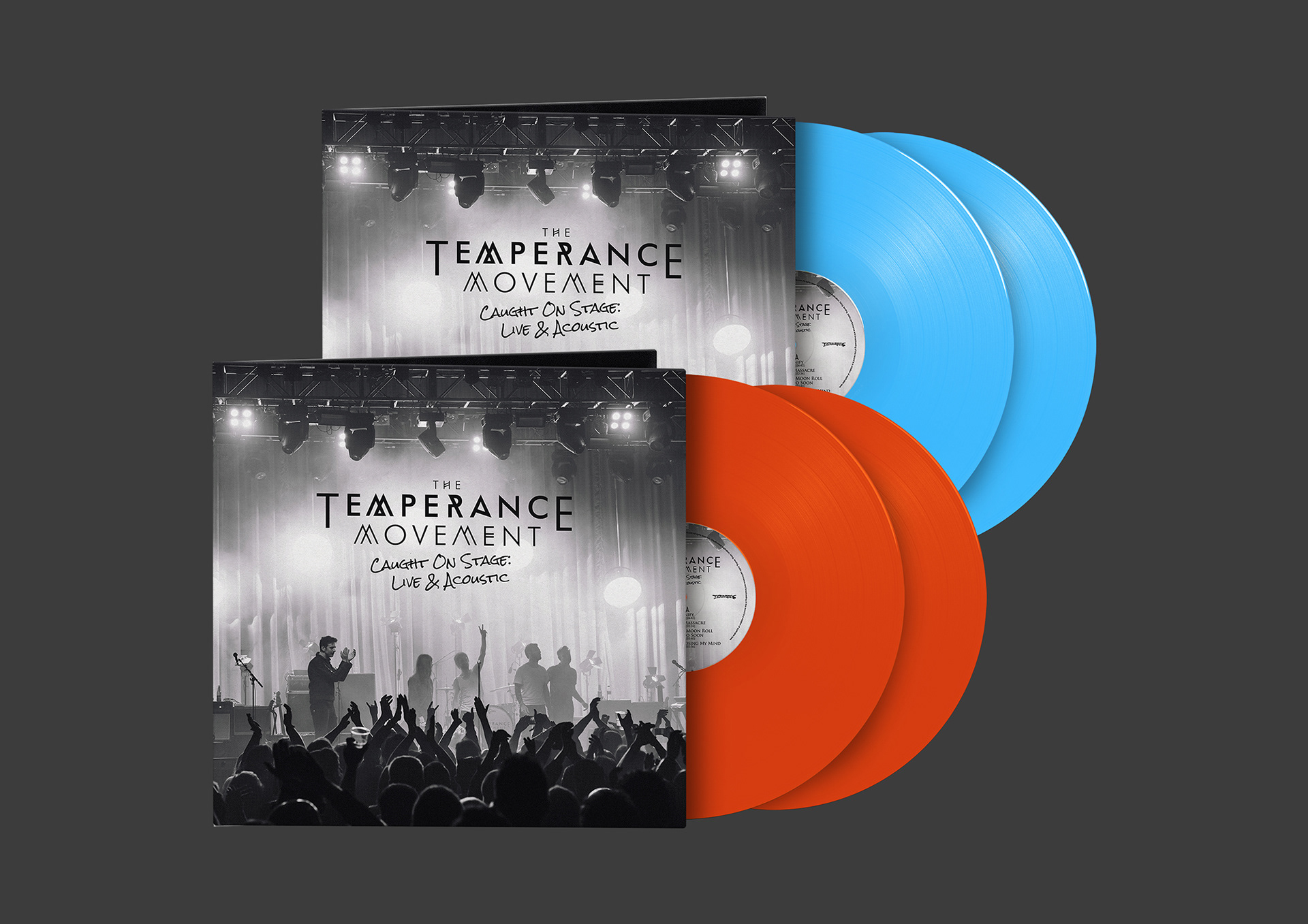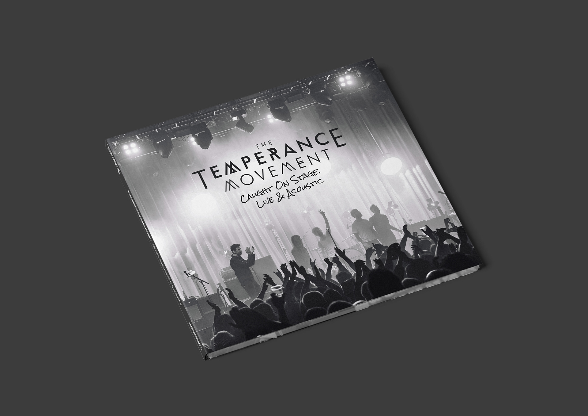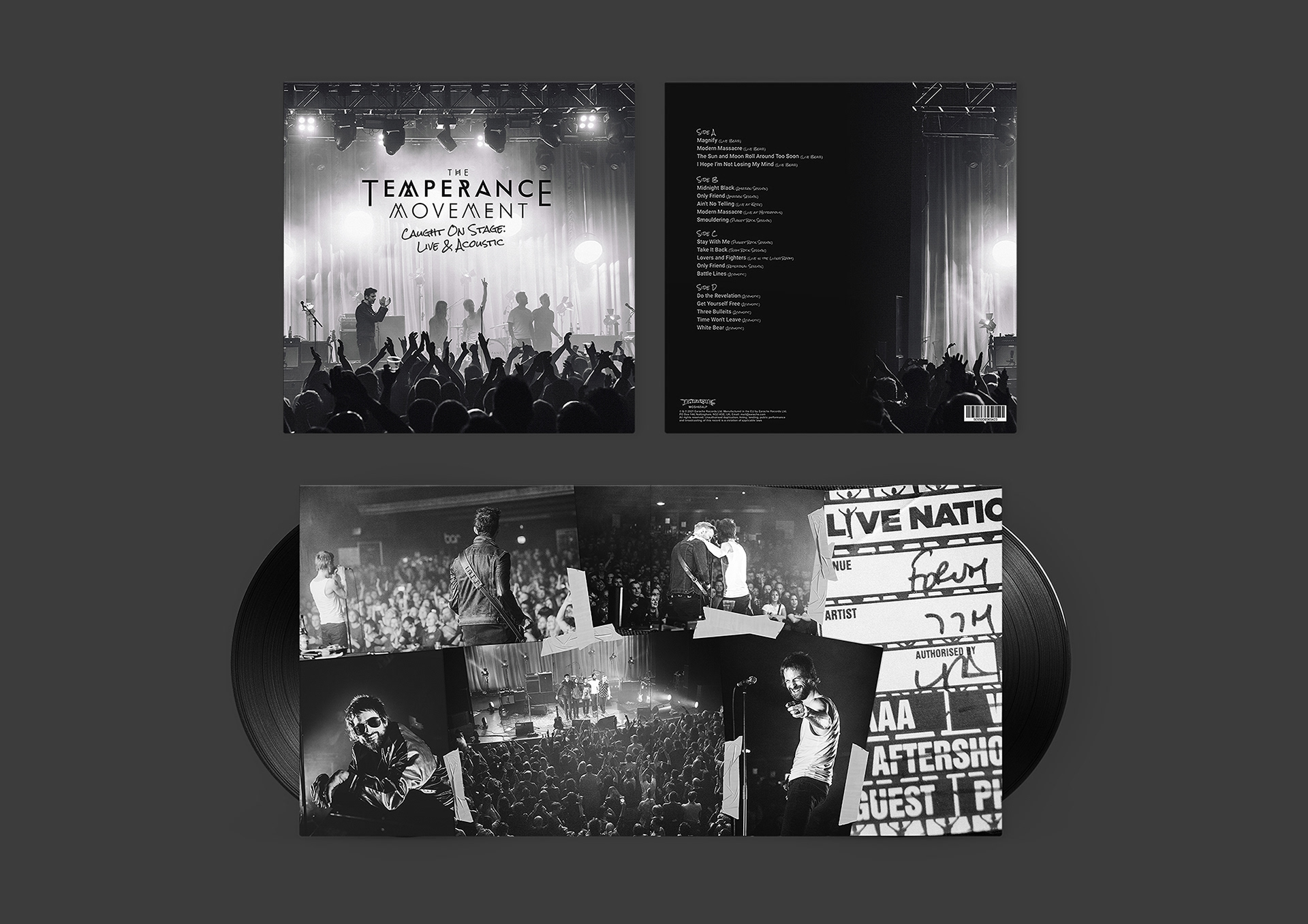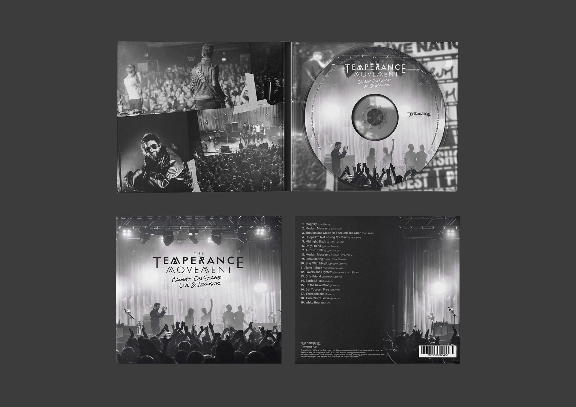 Layouts and marketing assets for the live album 'Caught On Stage: Live & Acoustic' by The Temperance Movement.
